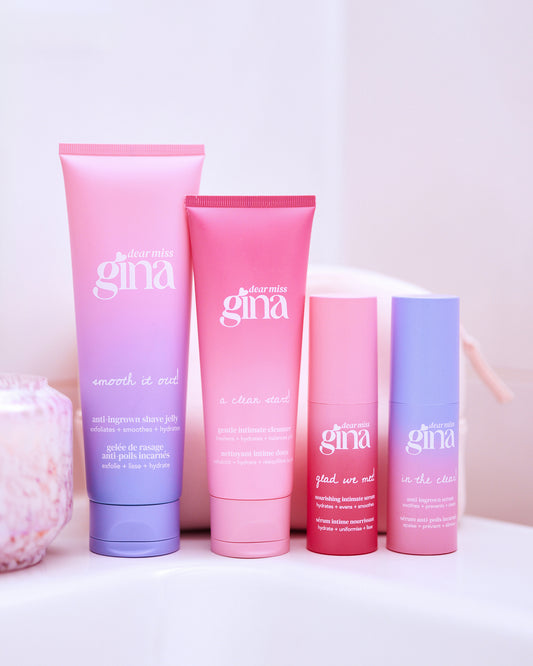 dear miss gina is intimate care, reimagined. With a focus on skincare, our gentle, pH-balanced products are made for your most delicate skin.They cleanse, shave, hydrate, and support your skin barrier, so your intimate routine isn’t just care—it’s confidence, comfort, and self-knowledge in one. love, gina.