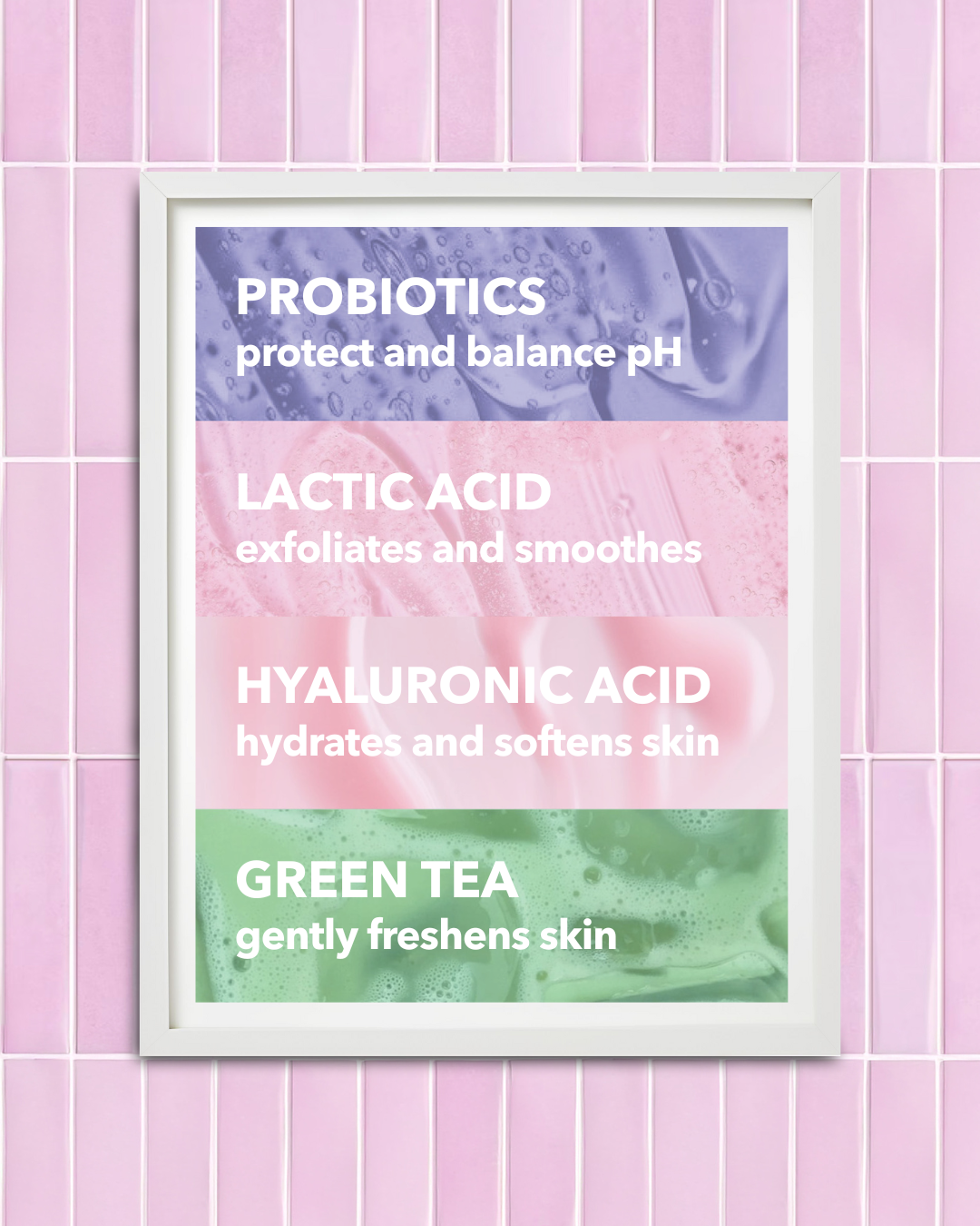 Water (Aqua), Coco-Glucoside, Glycerin, Cocamidopropyl Betaine, Xanthan Gum, Sodium Chloride, Phenoxyethanol, Caprylyl Glycol, Lactic Acid, Ethylhexylglycerin, Hexylene Glycol, Panthenol, Sodium Hyaluronate, Lactobacillus Ferment, Lactobacillus Ferment Lysate, Citrullus Lanatus (Watermelon) Fruit Extract, Lens Esculenta (Lentil) Fruit Extract, Citric Acid, Pyrus Malus (Apple) Fruit Extract, Sodium Lactate, Pentylene Glycol, Sodium PCA, Potassium Sorbate, Sodium Benzoate, Fragrance (Parfum), Citrus Limon Peel Oil, Linalyl Acetate, Limonene, Linalool.